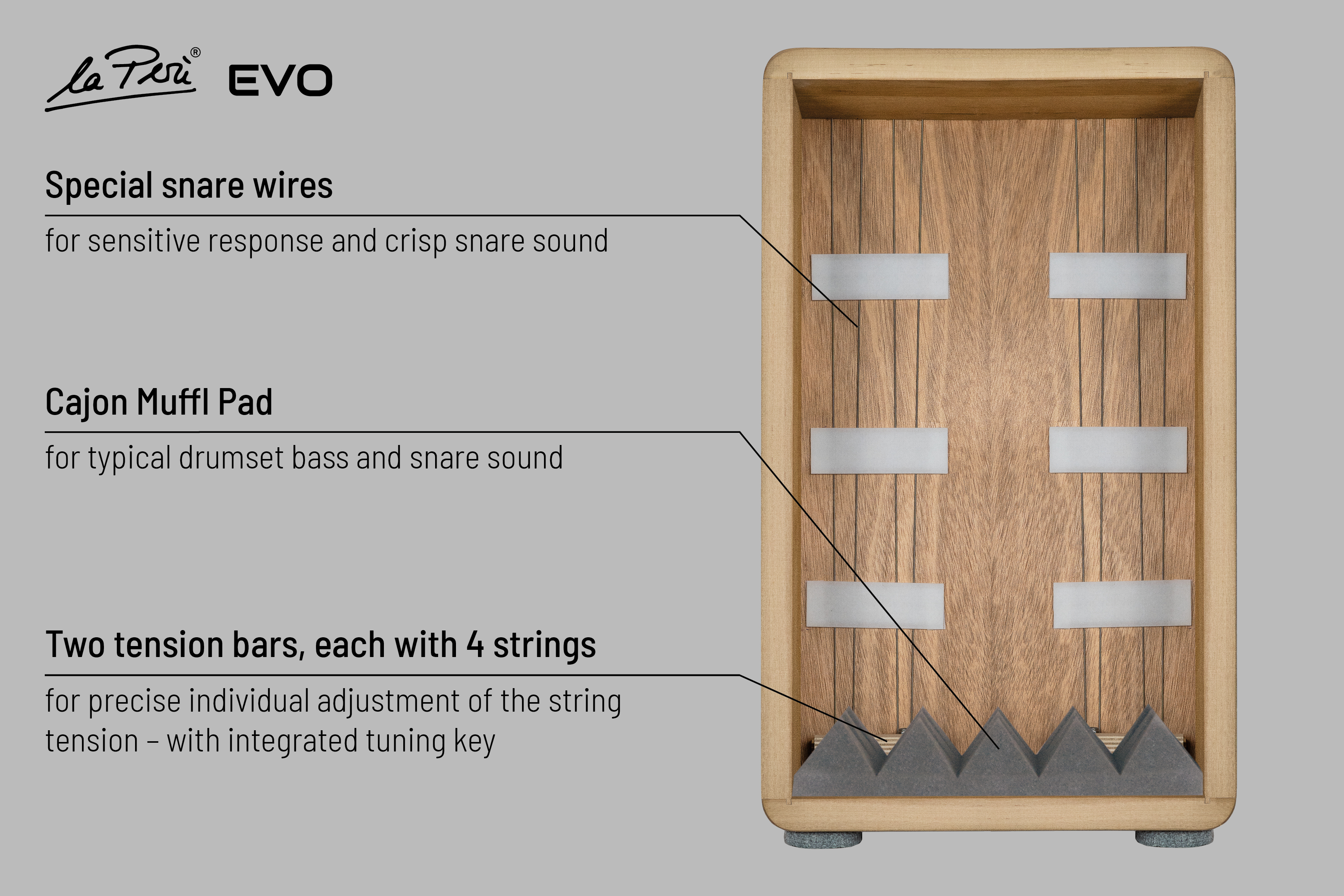 Leagues ahead in quality and sound definition: tried and tested a thousand times, La Perù® technology is based on special cajon strings, whose individual sounds can be adjusted with the help of tuning screws located at the base.The playing surfaces are supported by bases made of optimized woods.